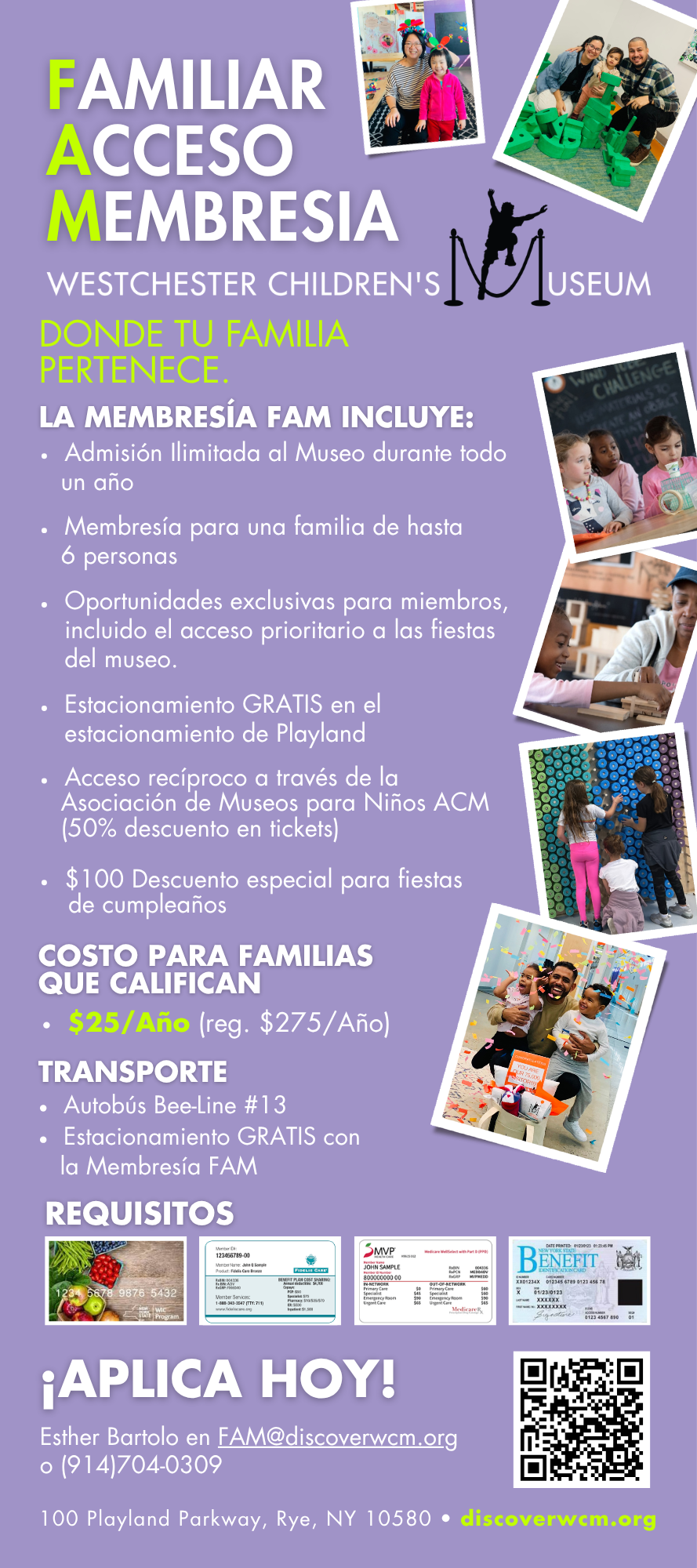 Or contact our Membership Manager, Esther Bartolo, at FAM@discoverwcm.org or (914) 704-0309