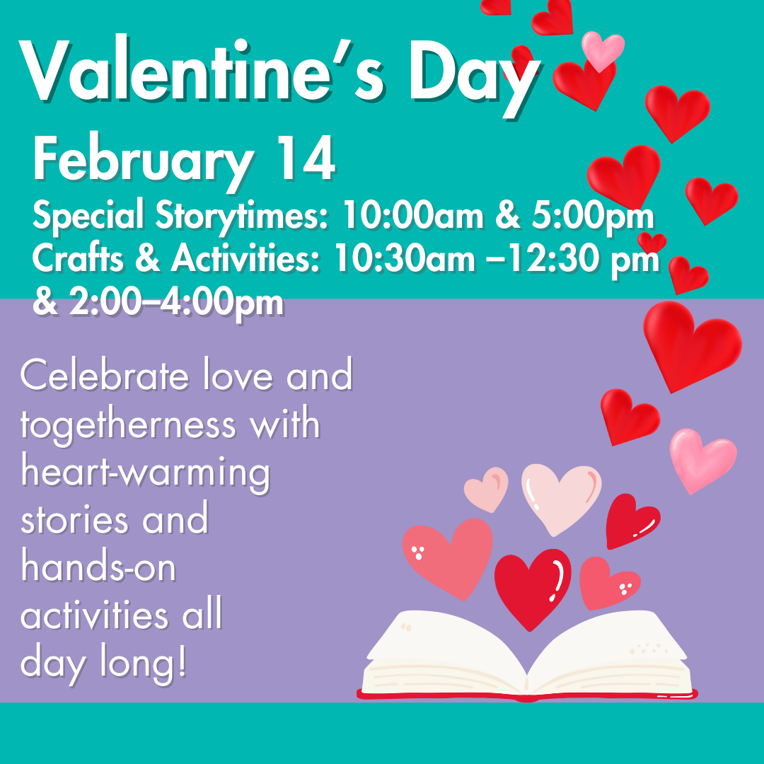 Celebrate Valentine’s Day at the Museum with Special Storytimes and hands-on activities all day long! Families are invited to enjoy heartwarming stories, create heart-shaped suncatchers or paper-roll heart paintings, and help build our collaborative “What I Love About My Family” wall or Tape Tapestry. A joyful day focused on love, creativity, and family connections.